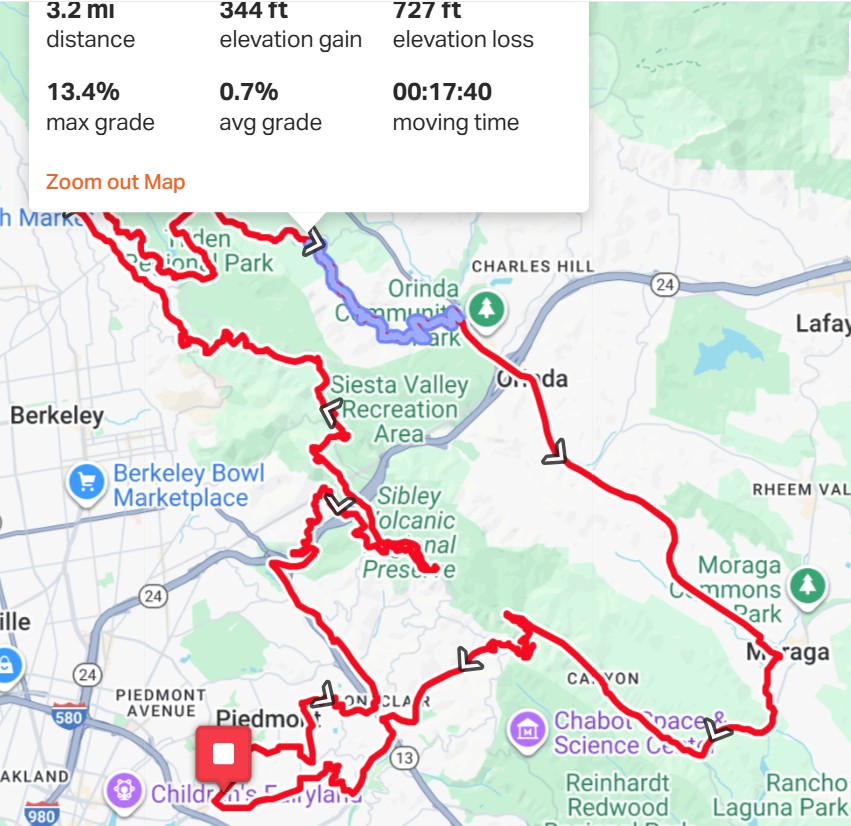 If you are unfamiliar with the El Toyonal option for avoiding the closure on Wildcat Canyon, the graphic below shows the El Toyonal route from Wildcat to Orinda highlighted in blue.