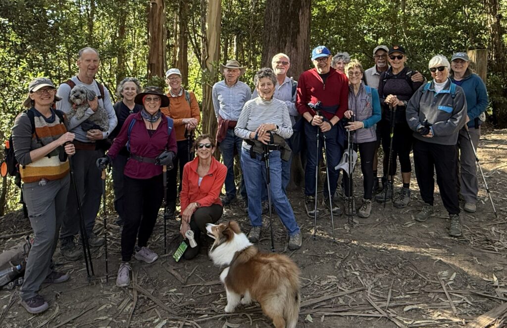 16 VeloRaptors and two dogs celebrated the Martin Luther King Jr. holiday with a hike in Redwood and Roberts Parks, starting at the Trudeau Center on Skyline Blvd in Oakland. We knew that there’d be a lot of hikers from the full car park and the “extra hike” getting to the meeting point from where we parked.
